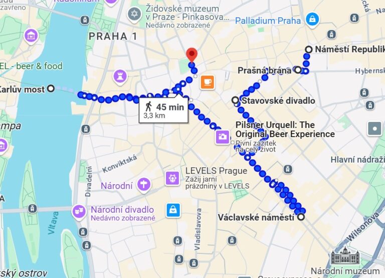 We would go by public transport to Namesti Republiky (Republic square) and continue by walking to Powder tower, Estates theater, Wenceslas square, Charles bridge, finishing at Old town square.