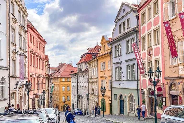 Our tour continues down Nerudova Street, one of Prague’s most famous streets, historically a bustling route for merchants. This cobbled lane is lined with beautiful, historic buildings adorned with charming house signs, leading us towards Prague’s downtown.